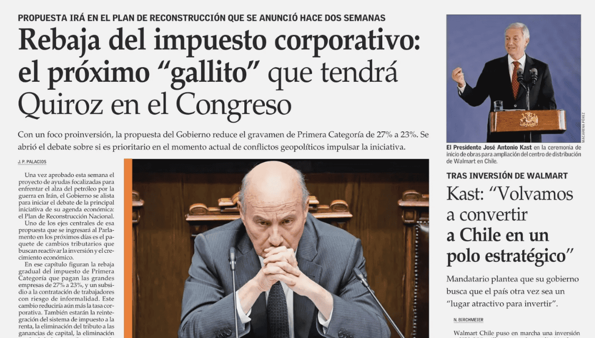 Rebaja del impuesto corporativo: el próximo “gallito” que tendrá Quiroz en el Congreso