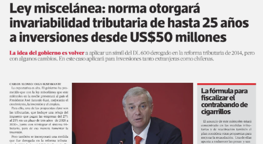 Ley miscelánea: norma otorgará invariabilidad tributaria de hasta 25 años a inversiones desde US$50 millones