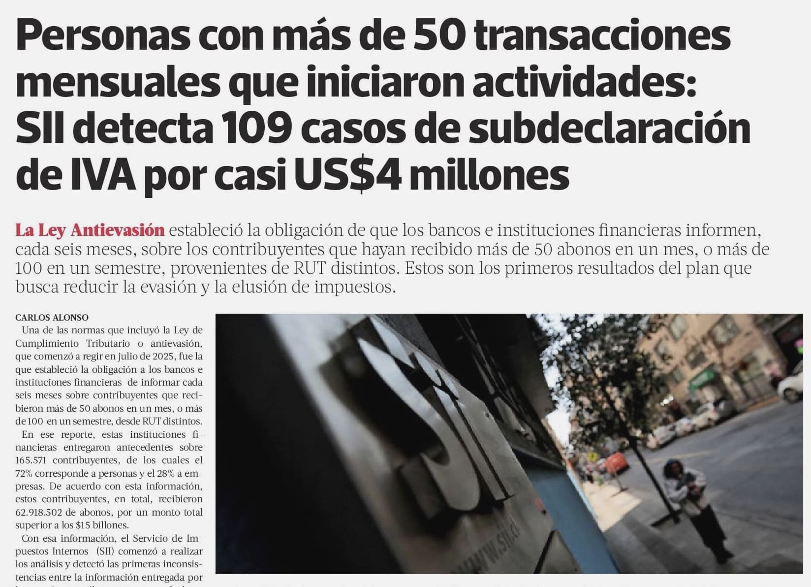 Personas con más de 50 transacciones mensuales que iniciaron actividades: SII detecta 109 casos de subdeclaración de IVA por casi US$4 millones