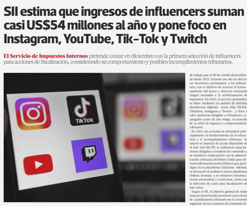 SII estima que ingresos de influencers suman casi US$54 millones al año y pone foco en Instagram, YouTube, Tik-Tok y Twitch
