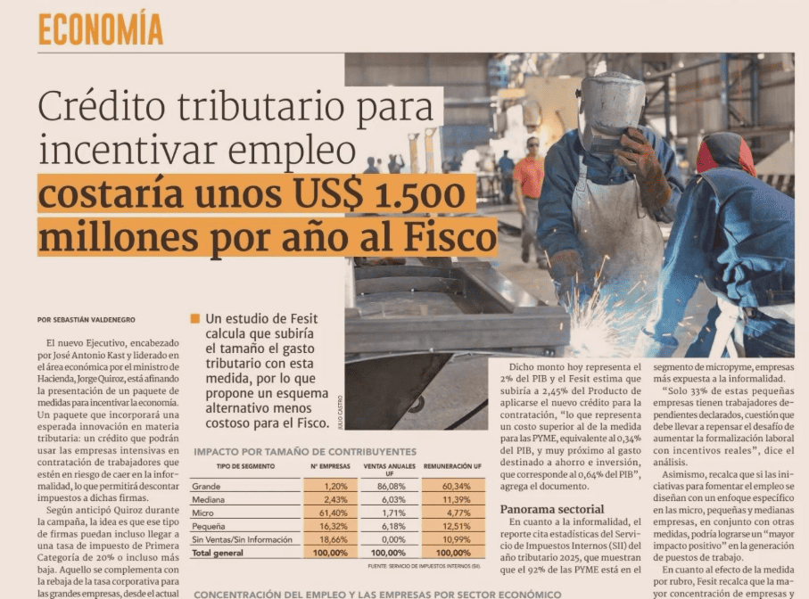 Crédito tributario para incentivar empleo costaría unos US$ 1.500 millones por año al Fisco