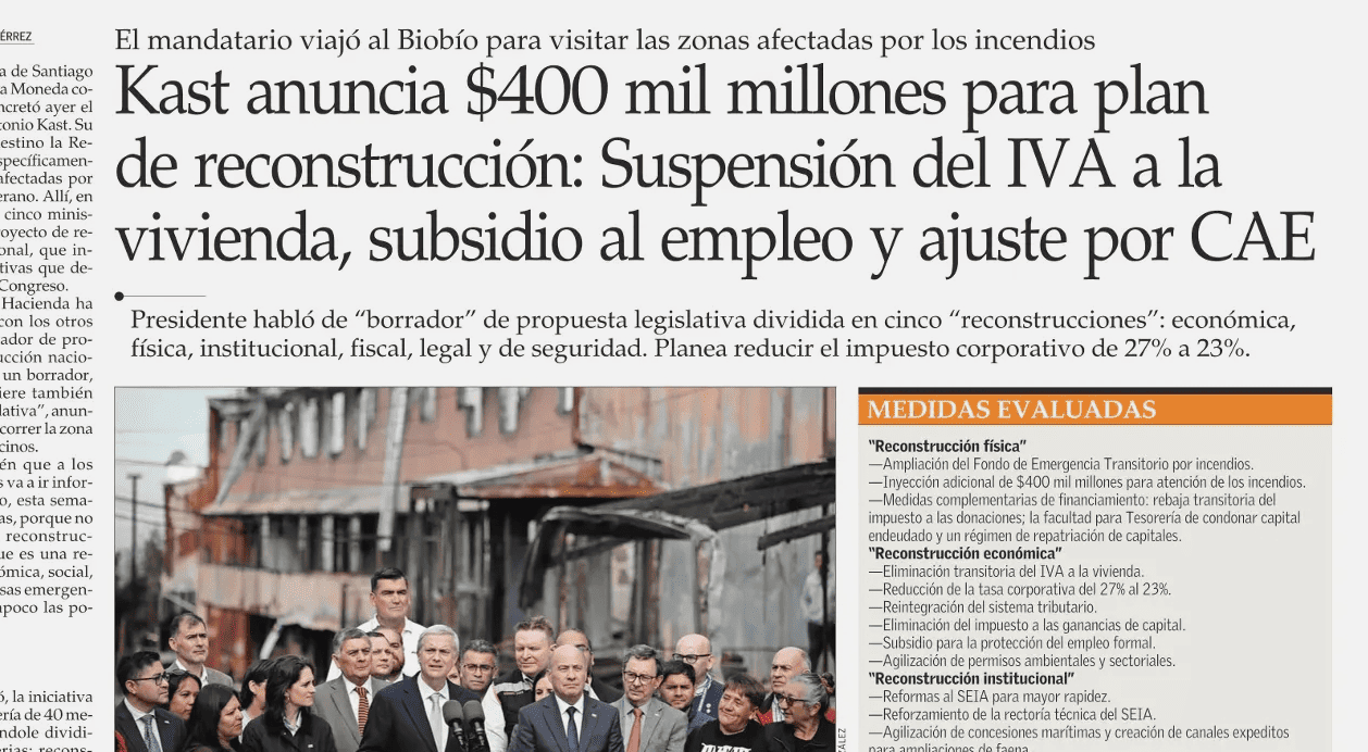 Kast anuncia $400 mil millones para plan de reconstrucción: Suspensión del IVA a la vivienda, subsidio al empleo y ajuste por CAE