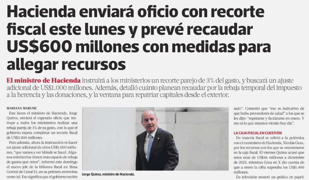 Hacienda enviará oficio con recorte fiscal este lunes y prevé recaudar US$600 millones con medidas para allegar recursos