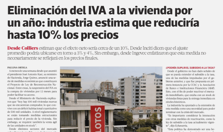 Eliminación del IVA a la vivienda por un año: industria estima que reduciría hasta 10% los precios